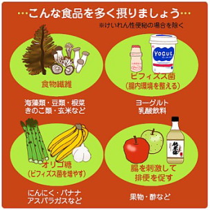便秘の解消には、まずは食物繊維をよく摂ること。食物繊維は善玉菌のエサになり、水分を吸収してスムーズに外に運ばれるうんちを作ってくれます。そして生きたビフィズス菌や乳酸菌の入っているヨーグルトや乳酸菌飲料を摂ること。腸内細菌は十人十色ですから、いろいろなヨーグルトを試して自分に合うものを見つけると良いです。オリゴ糖を加えるとより効果が高まります。そして、運動も大切です。ウォーキングなどでうんちを出す筋肉をつけましょう!
