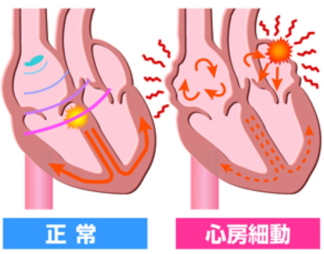 今年は記録的に遅い梅雨入りのようですね。さて、高齢社会とともに心房細動という不整脈が増えています。正常の心臓では洞結節(右心房)で作り出された電気信号が心室に伝わることで、心臓は一定のリズムで動いています。しかし心房細動は洞結節以外(左心房~肺静脈)で発生した異常な電気信号によって、心房がブルブルと痙攣したように動き、脈拍が不規則になります。また心房がブルブルと痙攣すると血流がよどんで、心房内に血栓(血の塊)ができやすくなります。この血栓が血流に乗って移動し(左心房→左心室→大動脈)、脳の血管に詰まると脳梗塞を引き起こすのです。