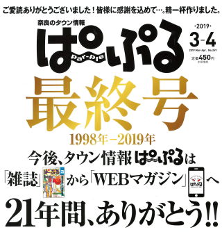 ところで、奈良のタウン情報誌「ぱ~ぷる」という雑誌をご存知でしょうか?医院の待合室に置いていたのですが、ついに20193-4月合併号で最終号となってしまいました。この雑誌は平成10年に創刊されて以来、21年間続いてきた由緒ある情報誌なのです。グルメやイベント紹介、地元民のスナップ写真などがメインのほんわかとした内容だったのですが、不人気だったのかネタが尽きたのか・・・ぱ~ぷるは数少ない奈良の地元情報誌だっただけに残念です。今後はWEBマガジンとして続いていくようですが、待合室で気軽に読めなくなってしまいました。最近では紙媒体からデジタル版へ移行するものも多いですが、やはり新聞や雑誌、コミックなどは紙媒体の方が存在感があって私は好きですね。電子媒体となると表紙が目に触れることもなく、消費コンテンツとしての側面が強くなり、その存在を忘れ去るのも早くなるというものです。紙を使わないのはエコなのかもしれませんけどね・・・またいつの日か、ぱ~ぷるには紙面で復活して欲しいです。
